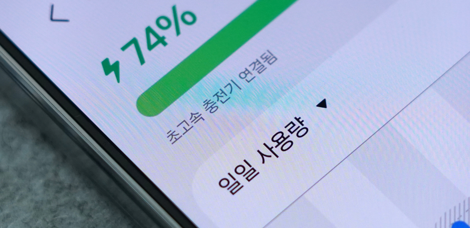 충전 중인 디스플레이와 제품 측면에 보이는 빌트인 케이블 + 잔량 확인 버튼입니다.