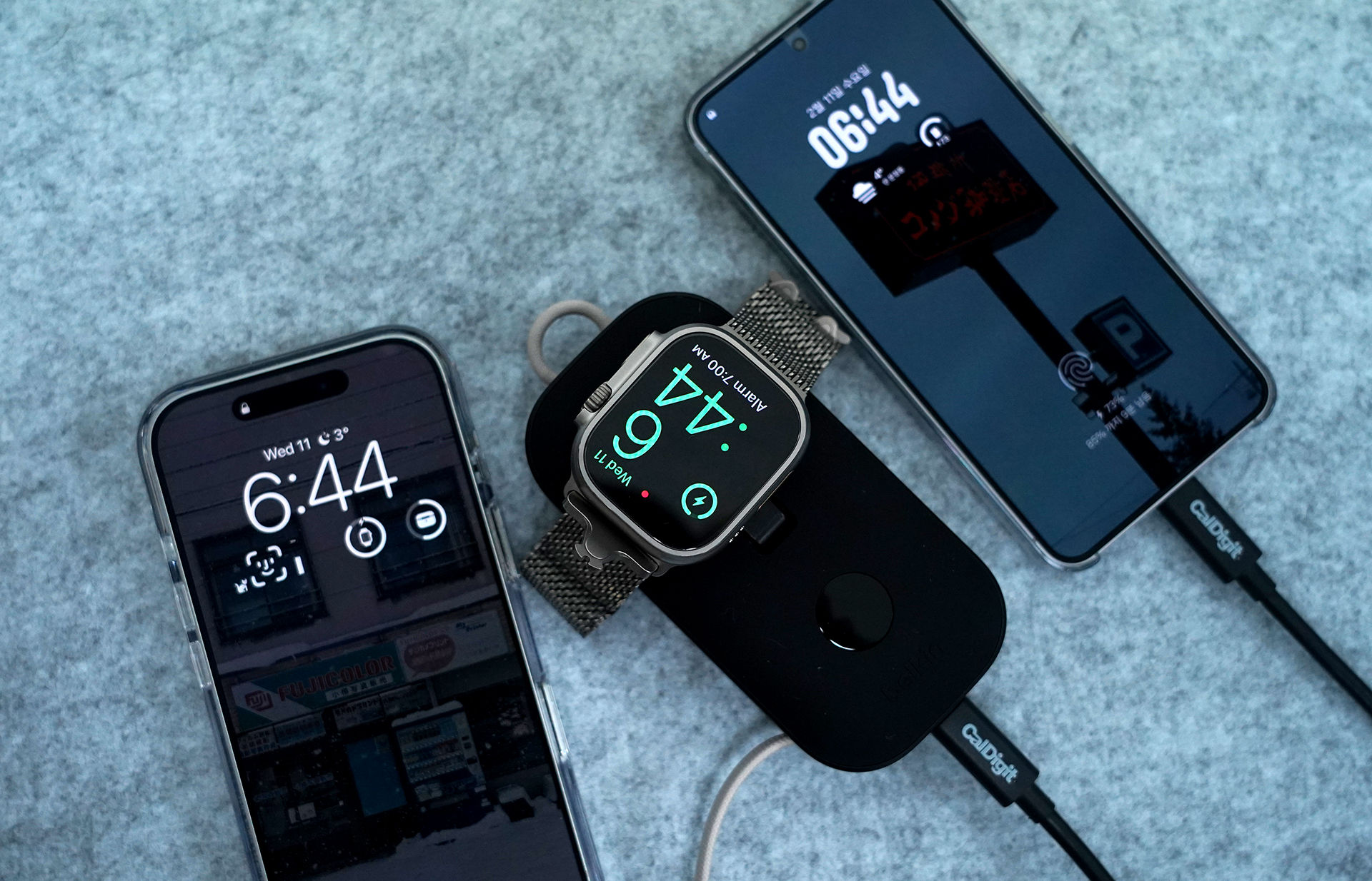 저는 이렇게 메인으로 사용하는 아이폰 17 프로와 애플워치 울트라2를 충전하면서 서브로 사용하는 갤럭시 S25까지 한 번에 충전해서 사용하고 있습니다. 때에 따라서는 갤럭시 S25가 아닌 아이패드 미니 A17 프로를 충전하기도 하고요.