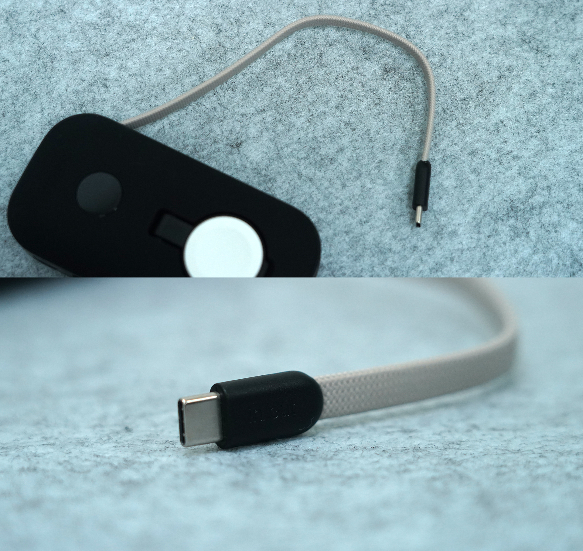 빌트인 케이블은 페브릭 재질이고 길이는 대략 20cm 정도입니다. 크게 불편함 없이 적당한 길이지만, 가방에 넣고 긴 케이블을 이용해 배터리를 충전하면서 사용하려면, 별도의 긴 케이블을 하단 USB-C 단자에 연결해서 충전할 수 있습니다.